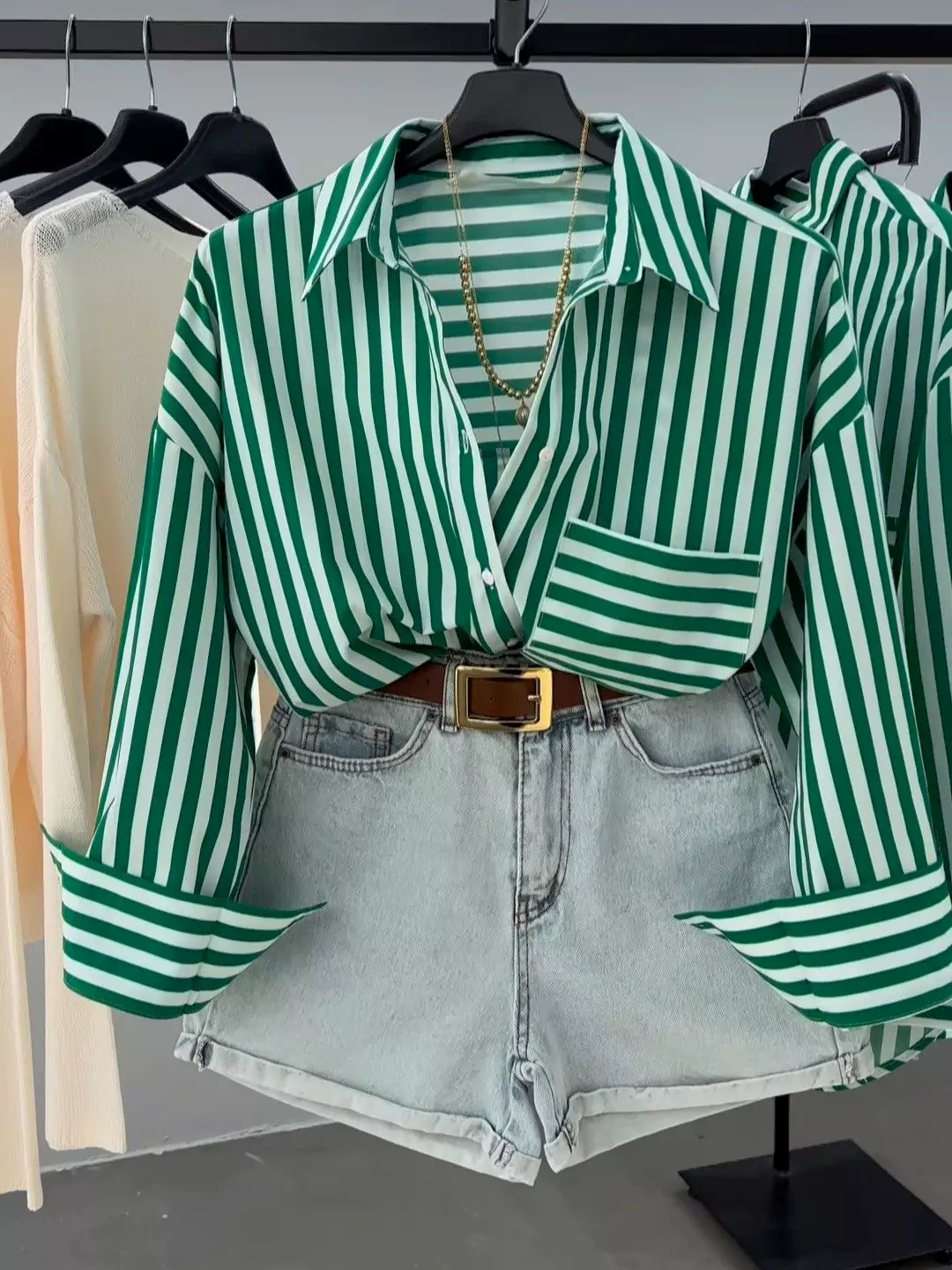 Ensemble chemise verte a rayures blanches+short jean taille S